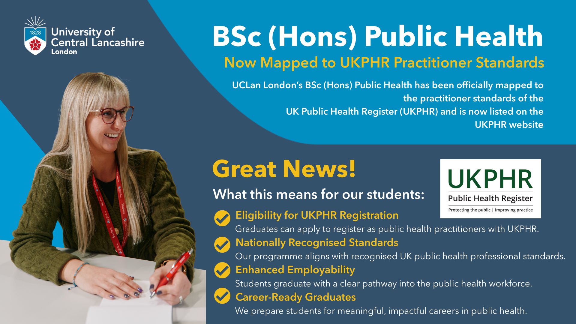 UCLan London is proud to announce that its BSc (Hons) Public Health programme has been successfully mapped to the practitioner standards of the UK Public Health Register (UKPHR) and is now officially listed on the UKPHR website under the mapping of BSc courses.