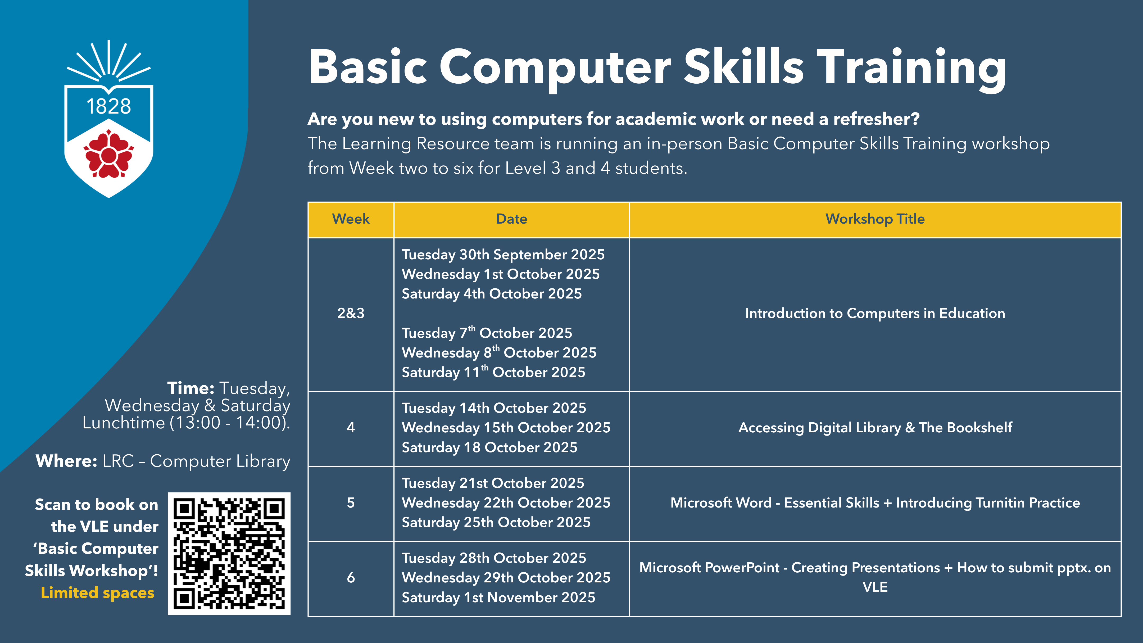 💻 Introduction to Computers in Education 📚 Accessing Digital Library & Kortext 📝 Microsoft Word – Essential Skills + 🔍 Introducing Turnitin Practice 📊 Microsoft PowerPoint – Creating Presentations + 🚀 How to Submit PowerPoint on VLE