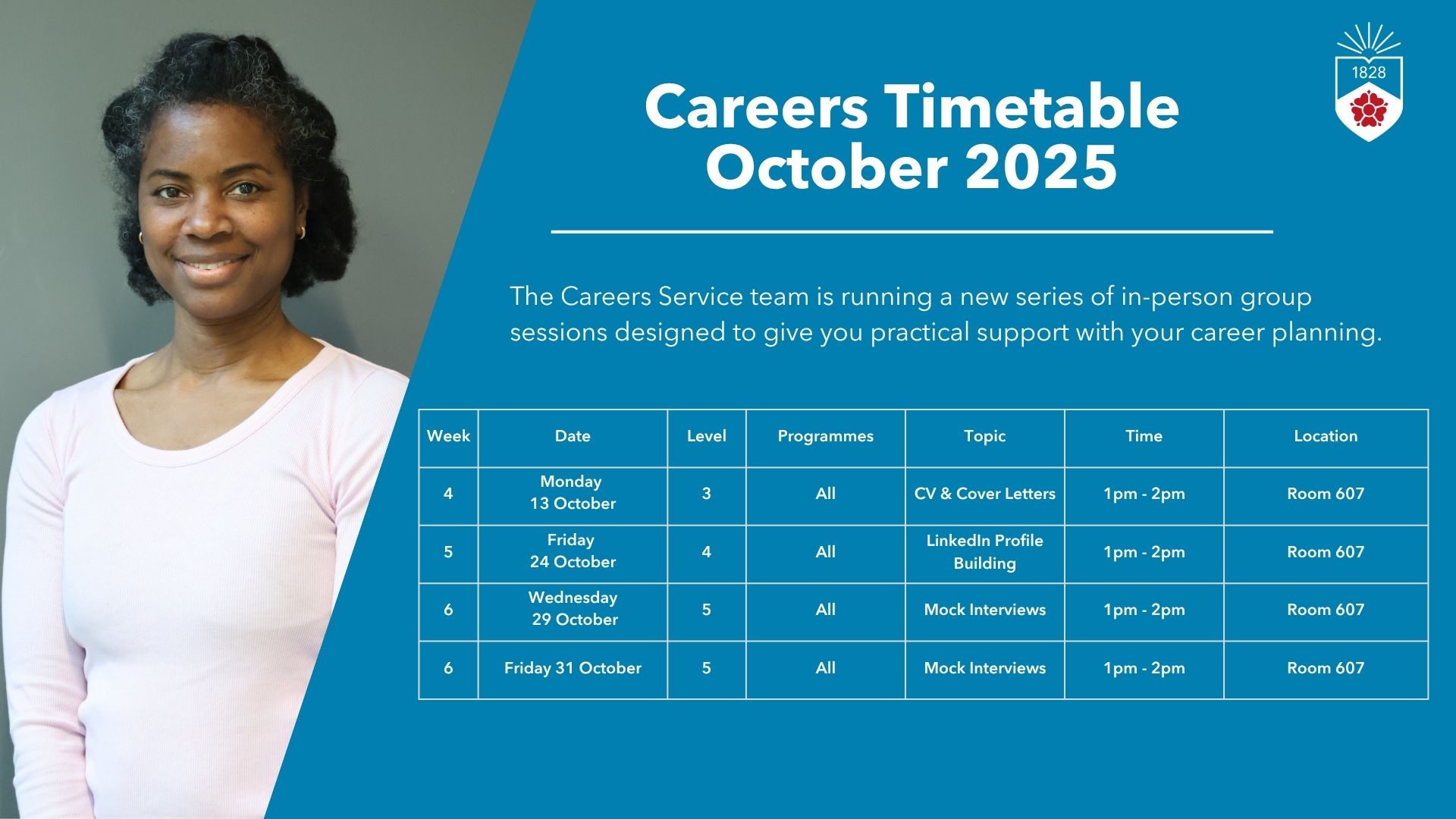 💡 Why attend? Each week covers some of the most requested employability topics, from CV and cover letters to LinkedIn profile building and mock interviews – giving you the confidence and skills to succeed.